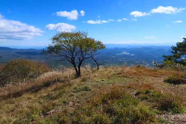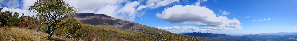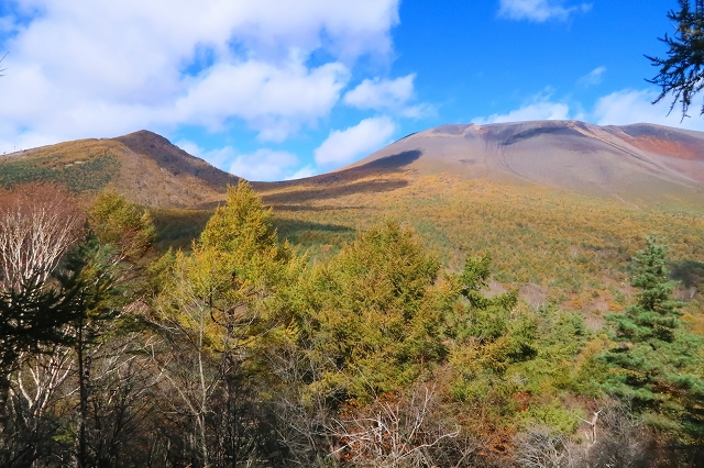 「おはぐろ池」からは登山道らしい道を辿って大きく左回りに石尊山山頂を目指すことになる。この付近になると落葉が進み晩秋の雰囲気さえある。頂上までの最後の上りで振り返ると「剣ヶ峰」と「前掛山」が圧倒的な迫力で迫って見えた。この二つのピークは剣ヶ峰は三角形の鋭鋒に、前掛山はなだらかに横たわっており対照的に見える。さらに上ると広々とした石尊山山頂に到着だ。山頂からは大展望が広がっていた。軽井沢から追分の町並みが美しい。その先には八ヶ岳がかすんで見えている。振り返れば前掛山が大きく迫り、噴煙が青空に吹き上がっているのが確認できる。50年前に来た時の記憶は全く蘇らなかった。こんな大展望があれば記憶に残っているようなものなのだが、月日の経過はそれをすべて失ってしまっている。ここで腰を下ろして白湯と菓子パンを食べてゆっくりと過ごした。眠気を感じるような良い天気で、熊のことがなければ、穏やかな気持ちで過ごせたのだが・・・