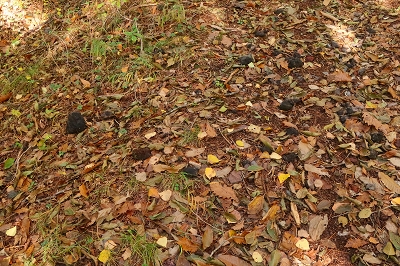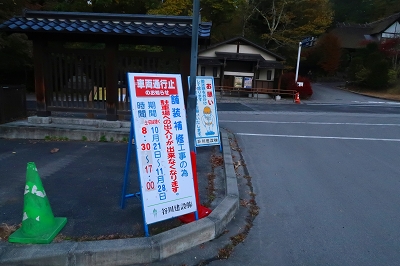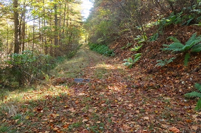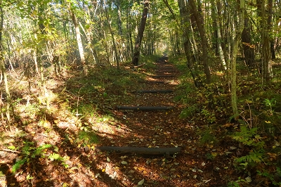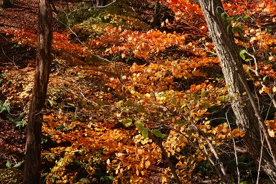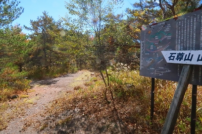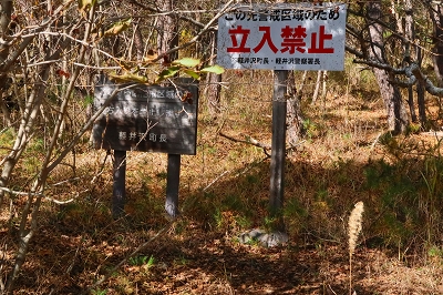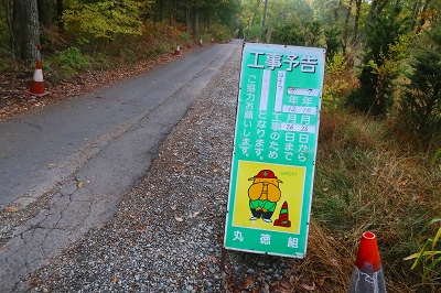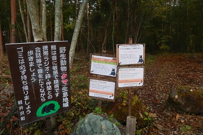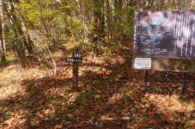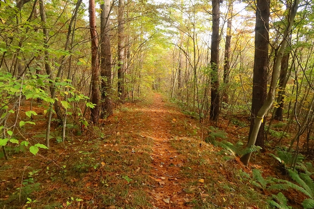 最近は毎日のように熊の人身被害が報道されている。今まで3回ほど熊に遭遇しているが、いずれも人の気配を察したならば逃げるというものだ。ところが最近の熊は人を恐れないどころか、人をエサとして認識し始めているようにも感じる。こうなると山歩きを趣味とするものは、気が気ではない。熊のいない山なんて存在しないからで、各県の熊出没マップを見ながら行先を検討した。そこで見つけたのが浅間石尊山である。この山はかれこれ50年ほど前に登っているのだが記憶が全くない。 10月28日(火) 自宅をゆっくりと出発して、碓氷バイパスを使って軽井沢に入る。追分宿の町営駐車場に着いたのは7時前だった。ゆっくりと支度を整えるが、護身用に持ってきたピッケルはさすがに大袈裟なので持つのは止めた。ザックを背負って歩き出すと、駐車場入り口に「10月21日〜11月28日までの平日は舗装工事のため駐車場の出入りはできません」と書いてある。今日の日付を確認すると、まさにドンピシャの日ではないか。さて困った!!ここに停めることができなければどうすればいいだろうか?どこかに路上駐車するしかないか。そこで登山口近くまで行ってみるが、なんとここも舗装工事をやるというではないか。しかたなく集落まで戻り、空き地に停めておくことにした。散歩の人がいたので、ここに停めるとトラブルになるか聞いてみた。どうやらここは私有地なのだが、問題はないだろうとのこと。確かに立ち入り禁止の標識もなく、ロープも張ってはいなかった。ところが散歩の人は、熊がいるから注意したほうがいいと余計な一言を言い残して行ってしまった。 歩き始めて15分ほどで車道に出る。通勤時間帯なので車が途切れずになかなか横断ができない。なんとか渡りきるとそこが登山口となっている。かつてはここに駐車できたのだが、今では大きな石が置かれて入り込むことは不可能だ。それにここには熊に対する注意書きが何枚も設置されていた。熊がいないことを想定してやってきたのに、どうやらここは熊の生息域そのものらしい。とりあえず熊鈴をストックにくくりつけて間断なく鈴が音を出すようにしておいた。 登山口からは高低差のない道を歩いていく。この付近はまだまだ紅葉は早いようだ。しばらく歩くと林道を横断することになった。林道といっても入り口が通行止めになっているのだろう。車の通行は限られているようだ。ここで下山してきた登山者とすれ違った。 「さっき、親子熊を見ましたよ」 「私の姿を見たら逃げていきましたハハハハハ」 「そりゃ怖いですね」 「可愛いもんでしたよ」 なんという素晴らしい情報だろう。ここは熊の生息域で、熊を避けたつもりが熊の巣窟に入り込んでしまったようだ。一瞬、帰ろうかと思ったがせっかく来たのだからとりあえず進んでみることにした。 道は直線的に林の中に延びている。静かなもので熊の気配は感じられないし、熊棚らしきものも見当たらない。しかし、熊の恐怖が払拭されないので熊鈴は途切れることなく鳴らし続けた。