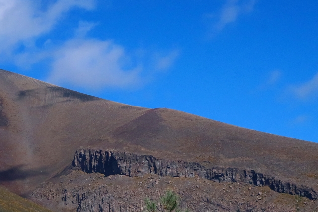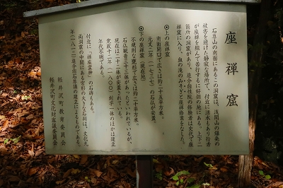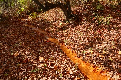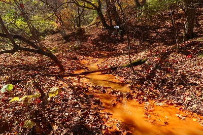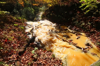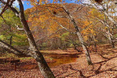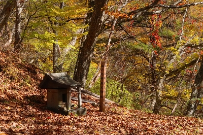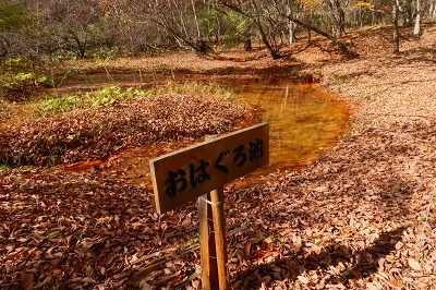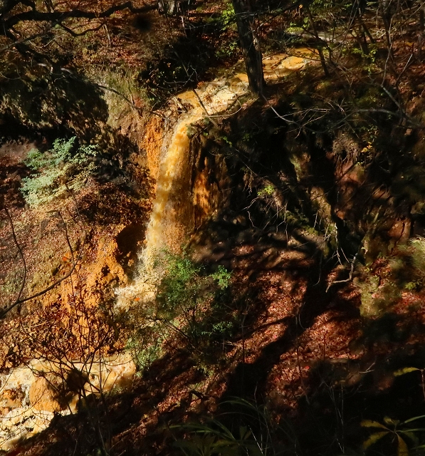 沢音が大きくなり、谷側を覗くと乳黄色の水が大量に流れていた。この沢に沿って登っていくと滝が見えてきた。これが「血の滝」と呼ばれるもので、鮮血を想像するが乳黄色のコーヒー牛乳に近いものだ。それにしてもこの色彩と水量は見事なもので、自然の作り出す不思議に驚嘆するばかりだ。滝の上部からは絶え間なく水が供給されている。この乳黄色の水は土砂を削って濁っているのかと思ったが、そうではないことが後にわかることとなる。 「血の滝」からさらに上ると林道に出る。この林道も車の通行は制限されているようで、轍は多くなかった。この林道は「座禅窟」というところに通じているらしいが、これは帰りに寄ることにして先に進んだ。今までと違ってちょっとだけ登山道らしくなり上りがきつくなった。この付近が紅葉の盛りらしいが、あまり色づきは良くない。突如、スピーカーの付いた防災無線の鉄柱が現れた。これは火山の噴火があった場合に稼働するようだ。その先が「血の池」となっていたが、池とは名ばかりで黄褐色の流れがあるだけだった。この流れを堰き止めればきっと池になるだろうと想像した。この流れを渡って上部に行くと、ここには池があり「おはぐろ池」の標識がある。この「おはぐろ池」は透明なのだが、ここから流れ出る場所の水は黄褐色に変色している。これは鉄分を含んだ水が空気に触れることによって酸化して変色するのだと気が付いた。水温はどうだろうかと手を差し込んでみると暖かいどころか冷たい。これが温泉だったら、かなりのものなのだが残念だ。またこの傍には石祠があり、10円銅貨の賽銭が置かれていた。この銅貨は緑青がなくピカピカに光っている。これは火山性のガスか何かの影響なのかもしれない。しかし、亜硫酸ガスや硫化水素の臭気は感じられなかった。
