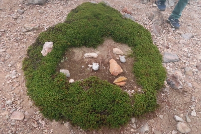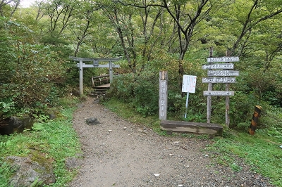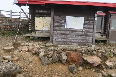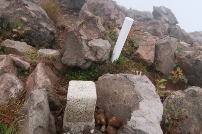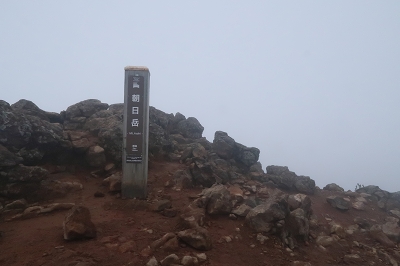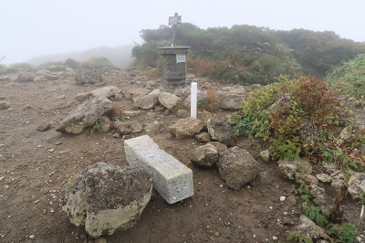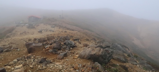 那須岳は以前から登りたいと思っていたが、諸々の事情で後回しになっていた。その事情も無くなったようであり、年齢的にもこの辺が登りどきと考えた。何しろ那須といえば紅葉の名所でその時期に登ることはどうしても気が進まない。9月下旬ならば空いているだろうと出かけることにした。 9月26日(金) 午前4時半に自宅を出発、関越道、北関東道、東北道と乗り継いで行く。2日前には区長会の視察で通った道なのだが、全く記憶が無い。それだけ個人的には気合が入っていない区長会ということなのだろう。那須塩原ICで降りて峰の茶屋登山口に向かっていく。オフシーズンでもあり平日ということで渋滞もなく峰の茶屋の大駐車場に到着する。駐車場は半分ほど埋まっているが、ガラガラといったところだ。見れば麓は晴れているのに那須岳方面は雲に覆われており、時折雨粒が落ちてくるような天候だった。他の登山者も車の中から出て歩くのを躊躇しているようにも見える。さらに雨具を着ている登山者も見受けられる。 気分は落ち込みがちだが、3時間かけてここまで来たからには引き返す選択肢はない。車から外に出て出発することにする。石段を登り舗装路を歩いて行く。鳥居をくぐり山道を登っていく。程なく灌木帯を抜けて石ころの道となる。石は火山特有の赤茶けたものだ。時折硫黄の臭気がするが、気分的なものかもしれない。登山者はまばらで適度な距離を保っているのでストレスは感じない。それでも大声で話す団体はそれなりに耳に入ってくるのでうるさい。やがて眼の前に建物が見えてきた。到着するとこれが峰の茶屋避難小屋だとわかる。かつては営業茶屋だったのだが、今では避難小屋となっている。中には入らずに外で白湯を飲んで休憩した。 避難小屋からは雲の中を歩くものだから、周囲は真っ白で登山道の石だけが目に付く。登山道は石が累々と続き歩きにくい。やがて傾斜が緩やかになると、右に分岐する道が出てくる。これはお鉢巡りで一周したときの合流点なのだろう。しかし、展望がきかないものだからGPSで確認するしか無い。右の道には入らずに直進すると三角点の表示がある。茶臼岳の山頂取りも低いところにあるので見向きもされない不遇の三角点ということだろう。更に歩くと一気に賑やかな声が聞こえるようになり、鳥居と石祠がガスの中に見えた。山頂標識の前では記念撮影の順番待ちができていた。茶臼岳はロープウエイで来た場合30分程で到着できるのでそれなりの軽装の人が多い。賑やかな山頂でちょっとだけ休憩してお鉢巡りをしてから行くことにしたのだが、その道の標識が見当たらないので、しばらく迷ってしまった。