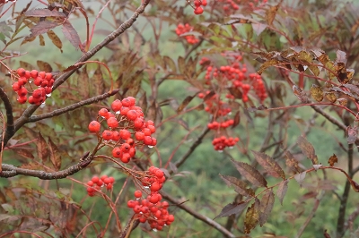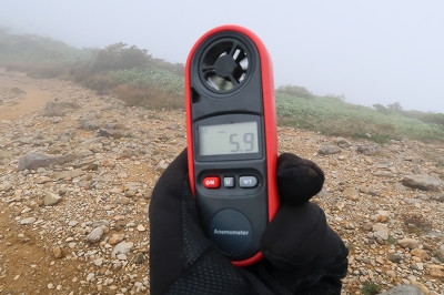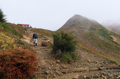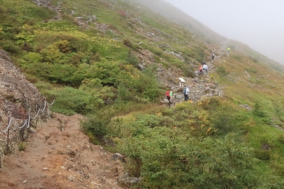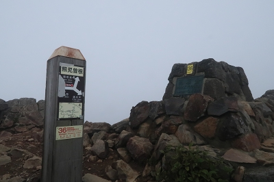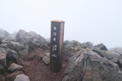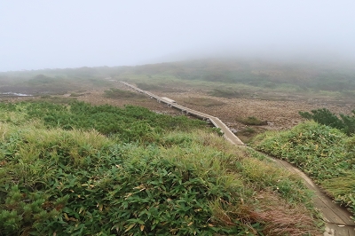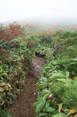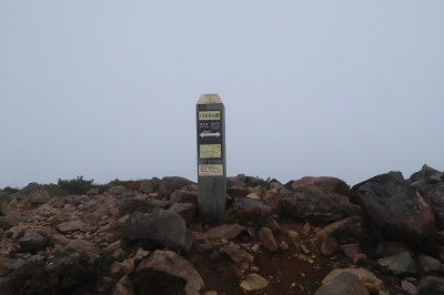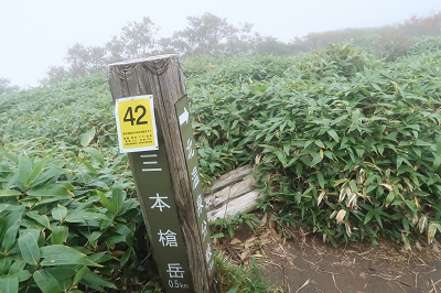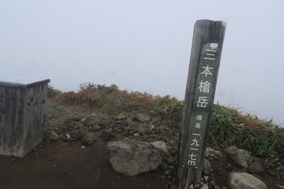 朝日の肩からひと登りすると朝日岳だった。晴れていれば大展望が広がっているはずなのだが、真っ白で何も見ることはできない。ほどなく到着した登山者と「最高の日を選んでしまいましたね」と愚痴を言い合った。山頂で菓子パンと白湯で栄養補給してから山頂を発った。 朝日の肩付近は風の通り道で風速は6メートル弱だった。ここからはなだらかな道が続き、熊見曽根という分岐を過ぎ、1900m峰をすぎると、一気に下降に転じ笹原の中を露に濡れながら下っていく。下りきったところが清水平で木道が設置されている。地形図からは湿原を想像するが、石を敷き詰めた場所に水が溜まっている雰囲気の場所が火山特有の雰囲気も見て取れるので、動植物は限られたものだけが定着するだけだろう。 清水平からは笹原の中の道を緩々と登っていく。時折現れるナナカマドの赤い実が秋を感じさせる。赤面山分岐までの道を登るとふたたび下降に転じるのだが、この道は泥濘がひどく足元は泥だらけとなってしまった。まるで田んぼの中を歩いているようなもので、この天候が余計に水分を補給しているようなものだ。下降が一段落して少し歩くと北温泉の分岐となるが刈払はされていないようで廃道に近い雰囲気だった。 北温泉分岐からは笹原の中の道を縫うように登っていく。ガスは相変わらずまとわりついて離れず息苦しくなるようでもある。メガネは水滴で曇って見えにくくなるので外してポケットにしまった。これだけで視界が明るくなりひらけたように感じる。やがて灌木も少なくなり、三本槍岳山頂に到着した。山頂は広い裸地となっており、三角点は埋没しておらず土の上に横たわっていた。かつて、甲子山から巣立山に登ったときに、もう少しで三本槍岳だと眺めた山頂にいると思うと感慨深い。山頂には数人のグループがいたので、離れた場所に陣取り昼食としたが、展望はなく休むと汗冷えがするのでゆっくりとはできなかった。