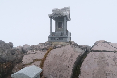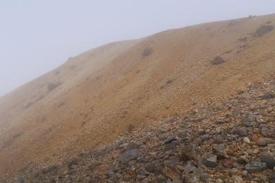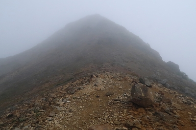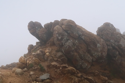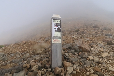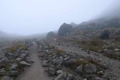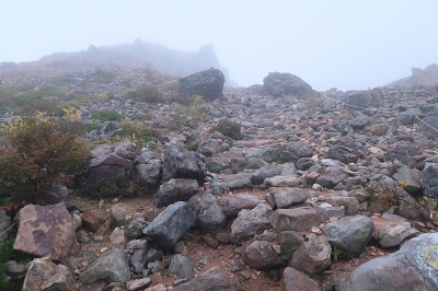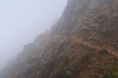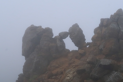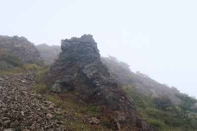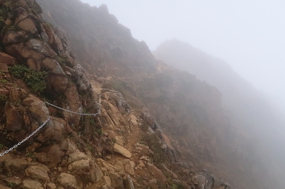 再び避難小屋に到着したが、ガスは相変わらず切れる様子はない。この付近は風の通り道なのだろう。風に恐怖を感じるほどで、眼の前の剣が峰は悪魔の棲む尖塔のように見えている。眼の前の剣ヶ峰は直登するのではなく周囲を回って迂回している。この道に入ると風は不思議と収まり、緊張は少しだが薄らいでいた。剣が峰と朝日岳の鞍部は岩のモニュメントが陳列されているような場所だった。ガスの中に自然が作った彫刻が浮かび上がっている様はあまり気持ちの良いものではない。中には絶妙なバランスで成り立っている岩もあり、いまにも崩落しそうな感じのものもあった。 道は更に険しくなり、岩場のトラバースが続くようになり、取り付けられた鎖につかまって歩く。足元は濡れており気を抜けばスリップして滑落は免れないだろう。いままで対向する登山者がいなかったのに、こんなところで3組の登山者とすれ違うことになった、かなり緊張しながら道を譲り合ってなんとか通過した。トラバースがすぎると今度はガレ場の斜面の登行となる。慎重に落石を引き起こさないように確実に登っていく。斜面を登りきると道が分岐する。ここは朝日の肩というところで、ここを起点にして朝日岳のピストンをする場所だ。休憩はせずに朝日岳を目指すことにする。